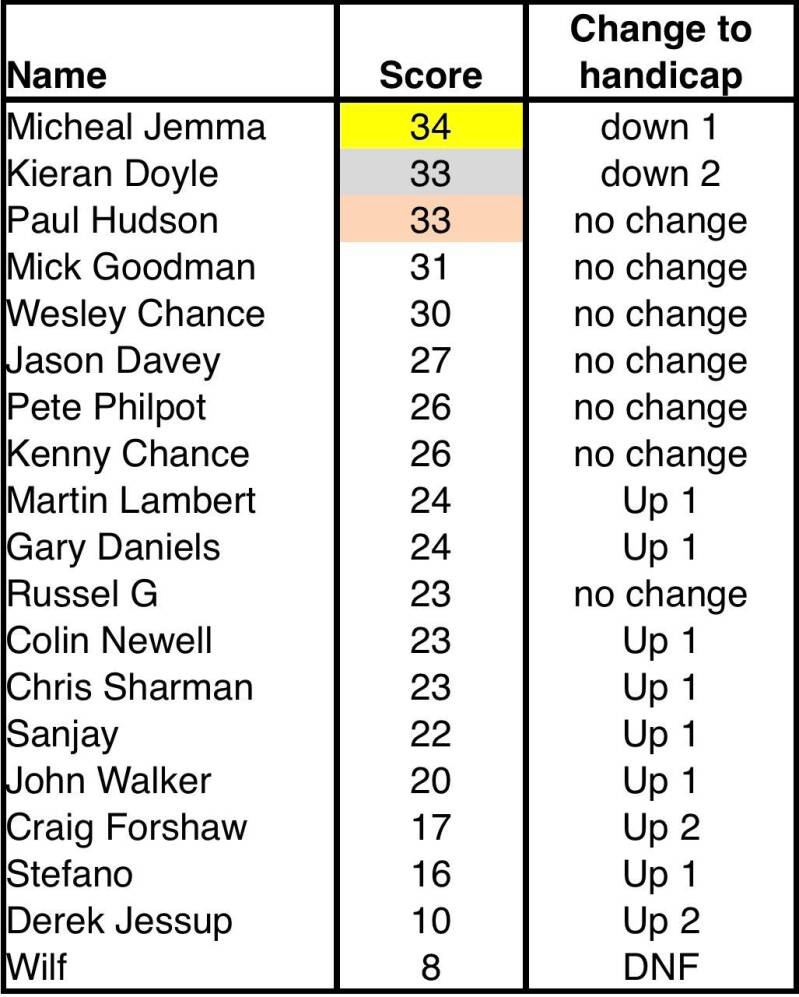 Just 9 players at this event. Breakfast then onto the first tee. Weather was bright with sunny spells and a reasonable temperature for this time of year. Most importantly it was dry. Yet again 1 player withdrew (again) sorry. So here are the days results.